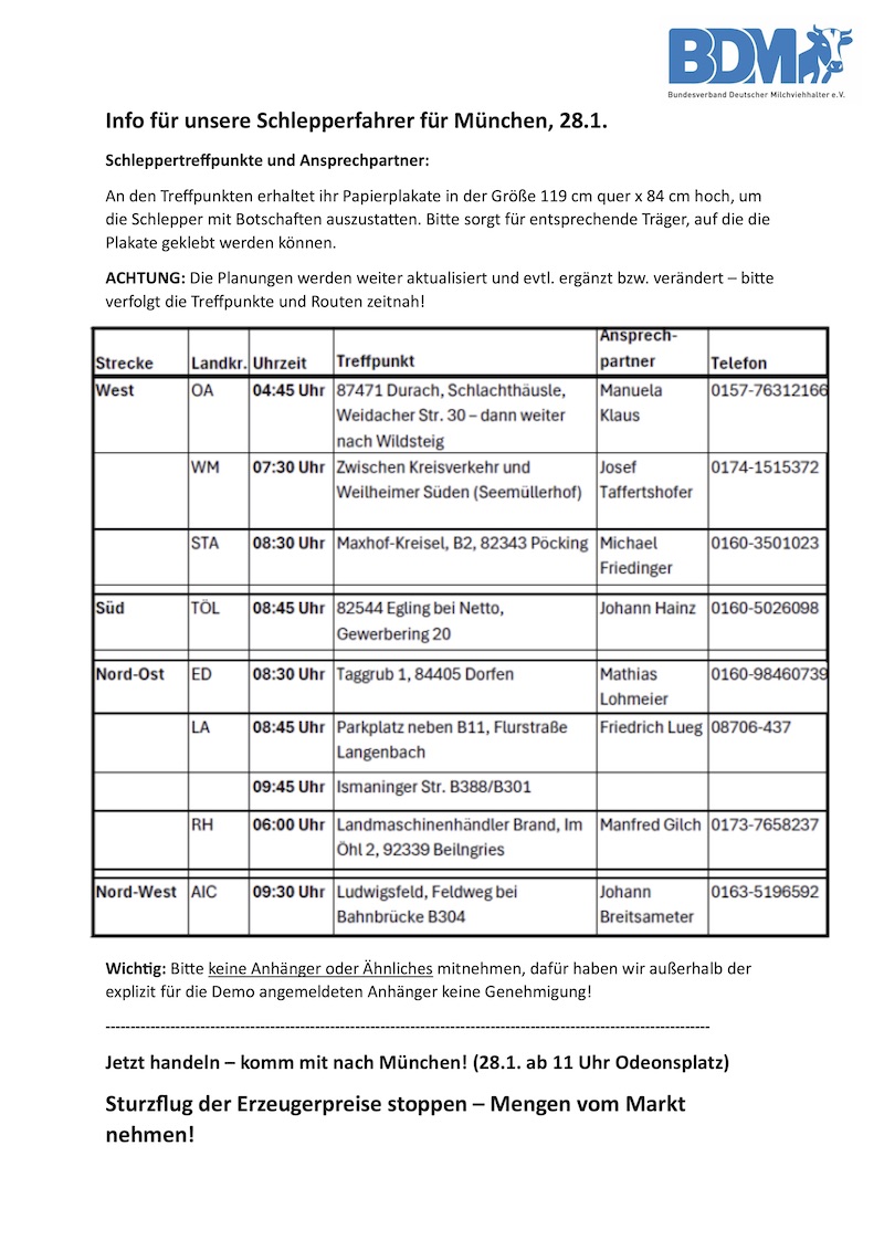 Auch für Kurzentschlossene die Treffpunkte der Schlepperfahrer, die aus verschiedenen Richtungen anrollen – zusammengeführt auf drei Sammlungspunkte vor München!